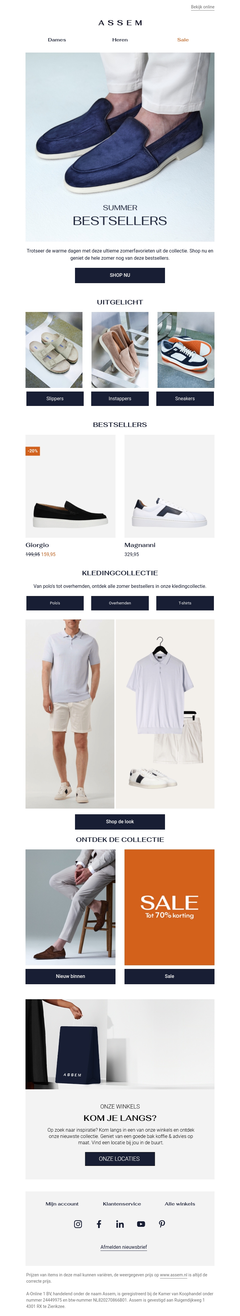 Trotseer de warme dagen met deze ultieme zomerfavorieten uit de collectie van ASSEM. Shop nu en geniet de hele zomer lang van deze bestsellers. Van slippers en instappers tot sneakers, we hebben alles wat je nodig hebt. Ontdek ook onze kledingcollectie met poloshirts, overhemden en t-shirts. Mis de SALE niet met kortingen tot 70%.