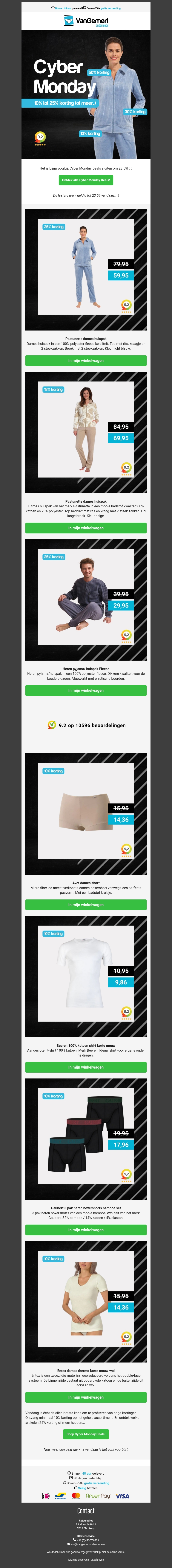 Cyber Monday sluit vanavond! Profiteer nog een paar uur van hoge kortingen tot wel 25% op diverse kledingstukken. Deze nieuwsbrief bevat geweldige deals op jeans, truien en meer. Wees er snel bij voordat de sale eindigt. Ontdek de aanbiedingen nu!