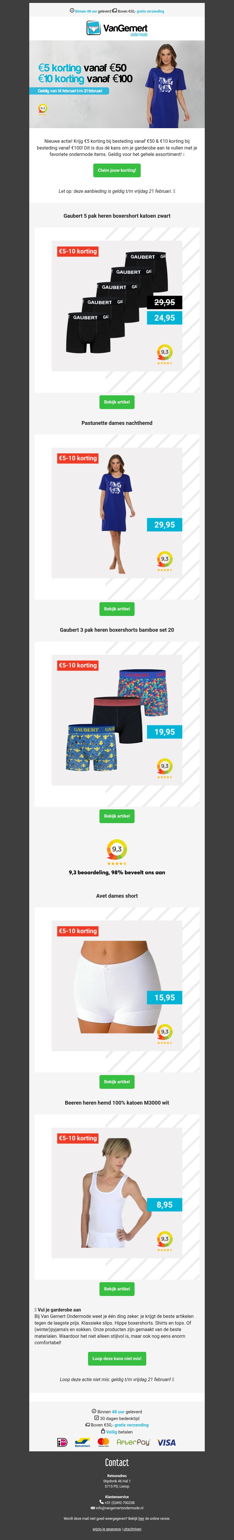 Ontdek de nieuwste aanbiedingen bij Van Gemert met kortingen tot €10. Van stijlvolle nachtmode tot comfortabele boxershorts, er is voor ieder wat wils. Mis de kans niet om te besparen op uw favoriete items. Bekijk de topkeuzes en scoor geweldige deals. Deze aanbieding geldt tot 27 februari, dus wees er snel bij!