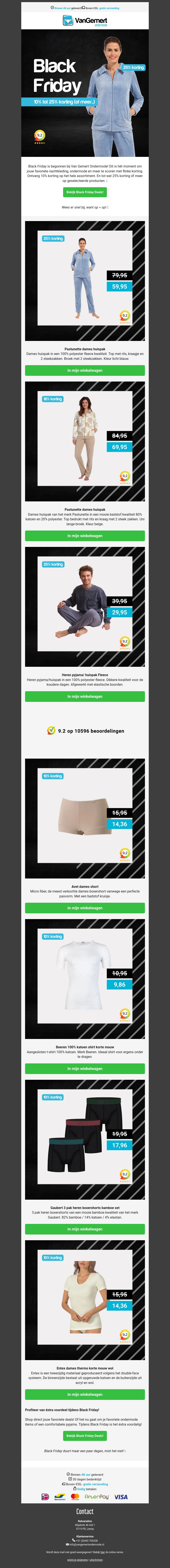 Van Gemert Ondermode biedt spectaculaire kortingen tot wel 50% tijdens Black Friday. Mis deze kans niet om stijlvolle kledingstukken aan te schaffen tegen voordelige prijzen. Of je nu op zoek bent naar comfortabele nachtkleding of dagelijkse basics, hier vind je alles. Bestel nu en profiteer van snelle levering en hoogwaardige service. Geschikt voor iedereen die waarde hecht aan stijl en comfort. Wees er snel bij want op=op!