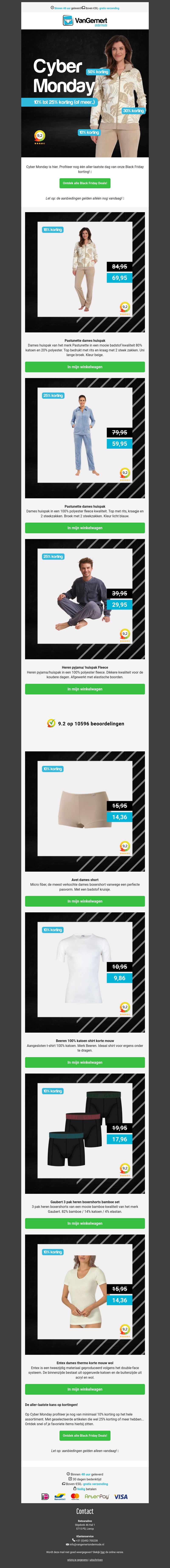 Profiteer van éxtra kortingen tijdens onze Cyber Monday actie! Van comfortabele pyjama's tot stijlvolle jassen, er is voor ieder wat wils. Mis deze kans niet om je garderobe uit te breiden met fantastische aanbiedingen. Beveilig jouw favoriete items voordat ze zijn uitverkocht. Shop veilig online en geniet van snelle levering. Actie geldt alleen vandaag!