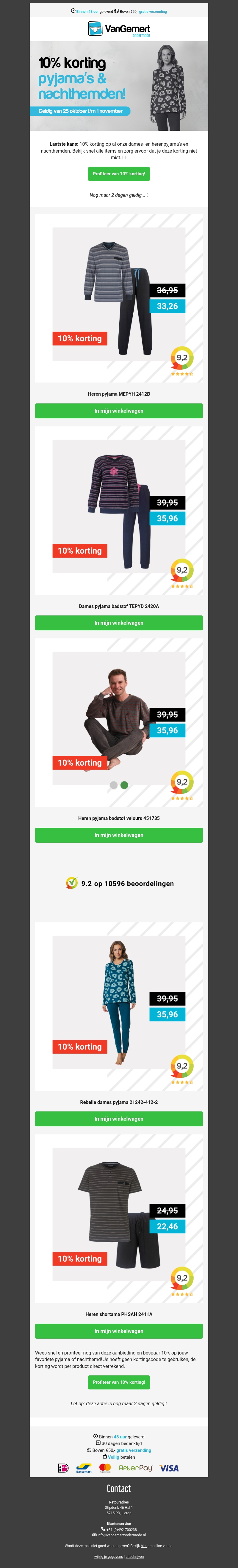 Ontdek onze exclusieve aanbieding: 10% korting op alle pyjama’s en nachthemden. Deze actie is geldig van 25 oktober tot 1 november. Snel, de tijd tikt! Bekroonde kwaliteit met een beoordeling van 9.2. Mis deze kans niet om stijlvol de nacht in te gaan.