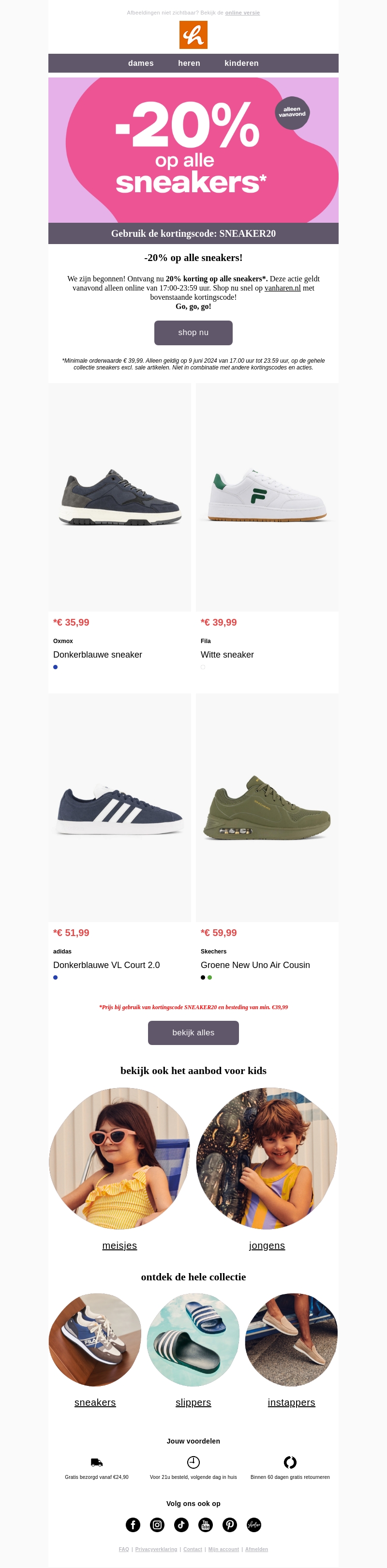 We zijn begonnen! Ontvang nu 20% korting op alle sneakers. Deze actie geldt alleen vanavond van 17:00-23:59 uur. Gebruik de kortingscode SNEAKER20 bij je online bestelling. Shop nu bij vanharen.nl en ontdek de nieuwste collecties sneakers voor dames, heren en kinderen. Mis deze kans niet!