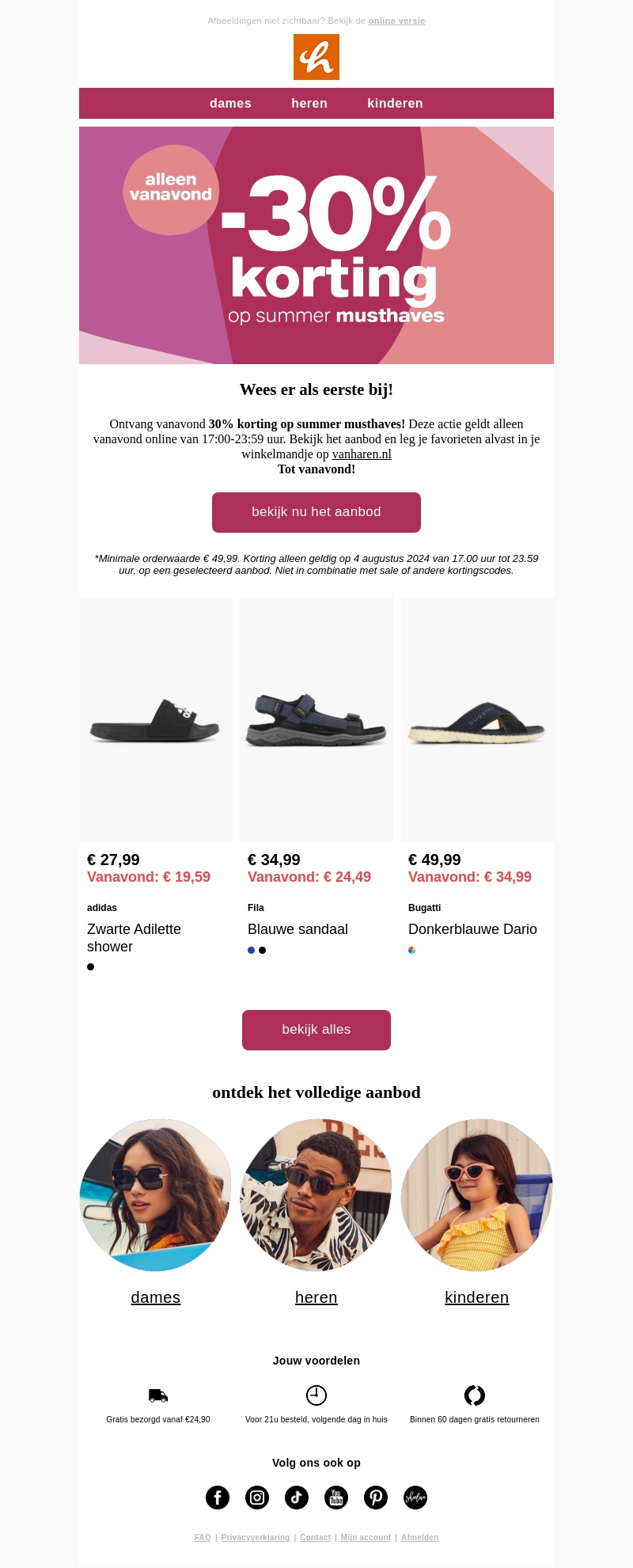 Alleen vanavond ontvang je 30% korting op summer musthaves! Bekijk het aanbod en bestel jouw favoriete items tussen 17:00 en 23:59 uur. Shop voor dames, heren en kinderen.