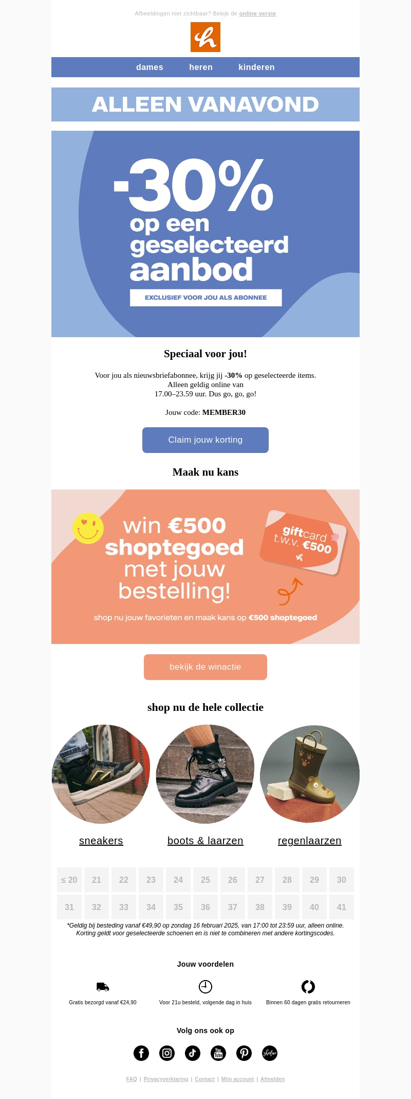 Mis het niet! Alleen vanavond: 30% korting op een geselecteerd aanbod. Speciaal voor nieuwsbriefabonnees, deze deal geldt van 17.00 tot 23.59 uur. Gebruik de code MEMBER30 en claim je korting nu. Shop je favoriete items en maak kans op โฌ500 shoptegoed.
