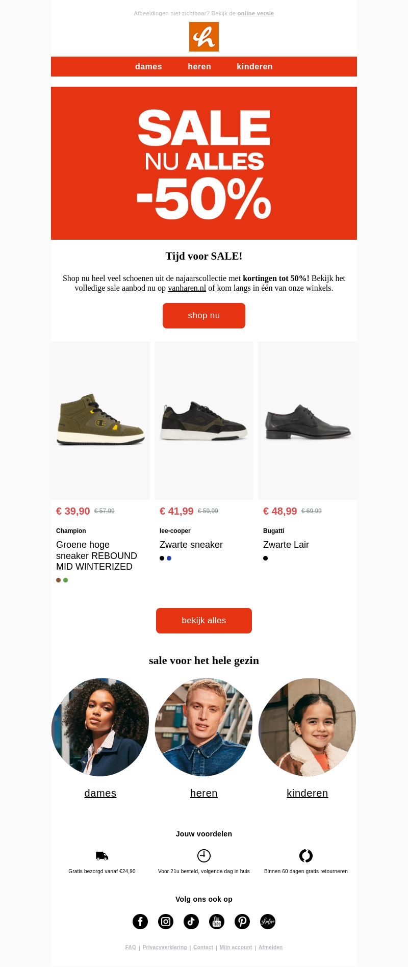 Het is tijd voor een grote uitverkoop met kortingen tot wel 50% op veel artikelen. In deze nieuwsbrief vindt u de beste aanbiedingen uit de najaarscollectie van schoenen. Bezoek onze website of winkel om het volledige sale-aanbod te bekijken. Mis deze kans niet om uw favoriete items tegen een gereduceerde prijs te kopen.