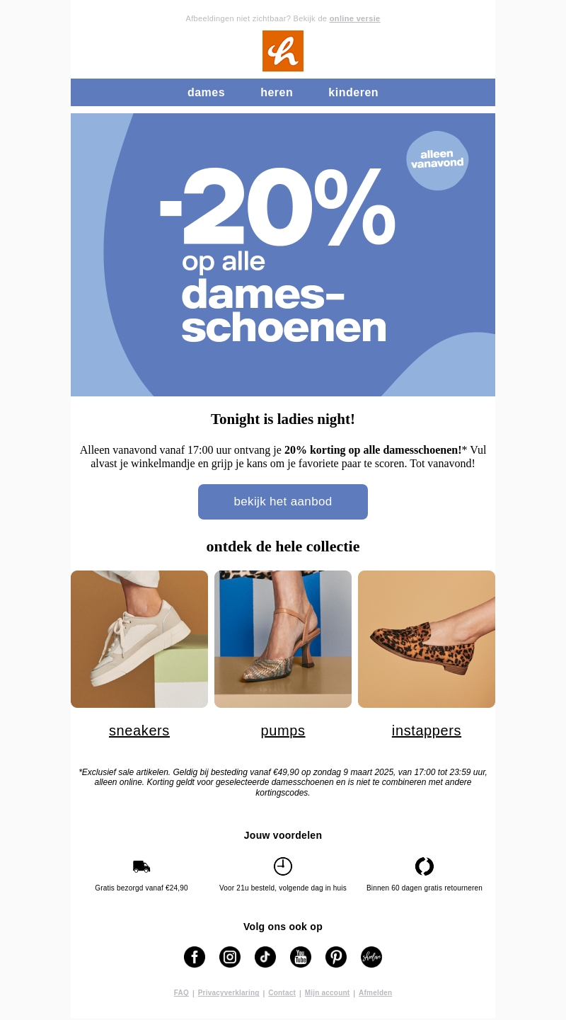 Vanavond is het Ladies Night met een exclusieve korting van 20% op alle damesschoenen. Vul snel je winkelmandje en shop je favoriete paar. De aanbieding is geldig vanaf 17:00 uur en alleen vandaag. Profiteer van gratis verzending vanaf €24,90 en snelle levering. Grijp je kans en upgrade je schoenencollectie.