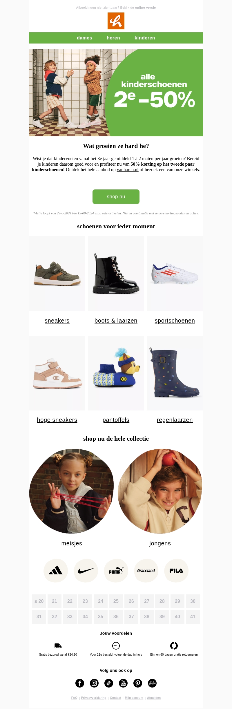 Kinderkleding groeit snel! Profiteer nu van een fantastische aanbieding bij vanharen.nl: 50% korting op het tweede paar kinderschoenen. Zorg ervoor dat je kinderen altijd goed schoenen hebben voor elke gelegenheid. Shop nu online of bezoek een van onze winkels.