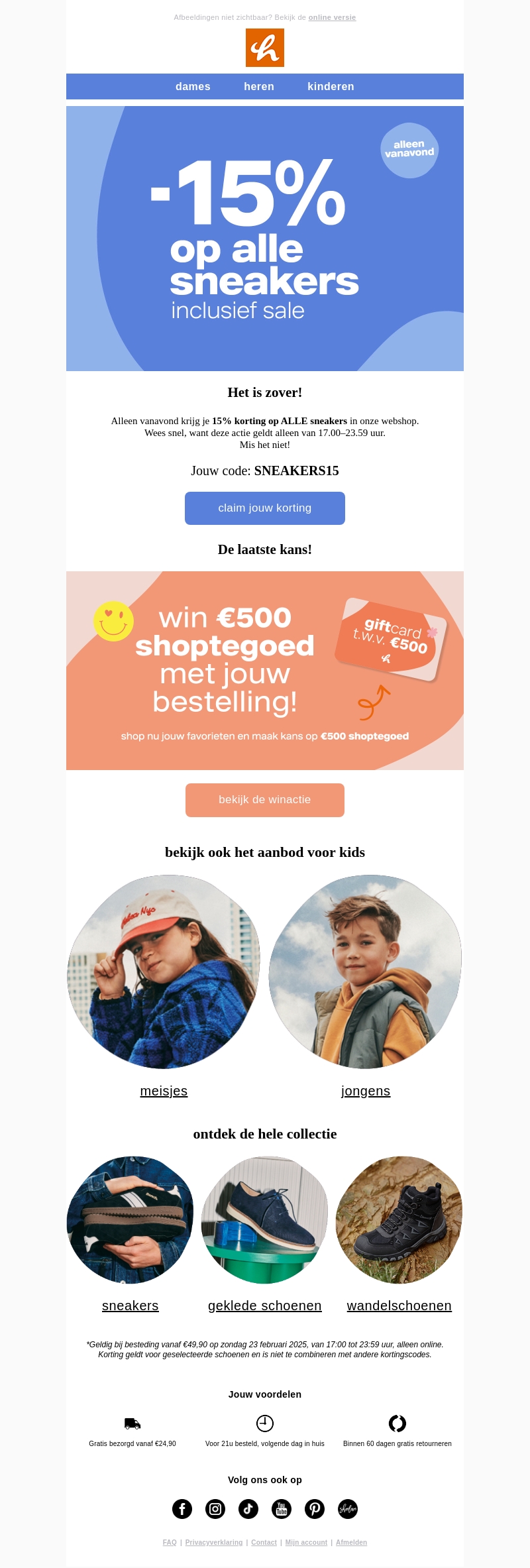 Profiteer alleen vandaag van een speciale 15% korting op alle sneakers in onze webshop. Vergeet niet de couponcode SNEAKERS15 te gebruiken om te besparen op je volgende aankoop. Deze aanbieding is kort beschikbaar, dus wees er snel bij. Ontdek ook ons aanbod voor kinderen en maak kans op β¬500 shoptegoed. Ideaal voor elke sneakerliefhebber!