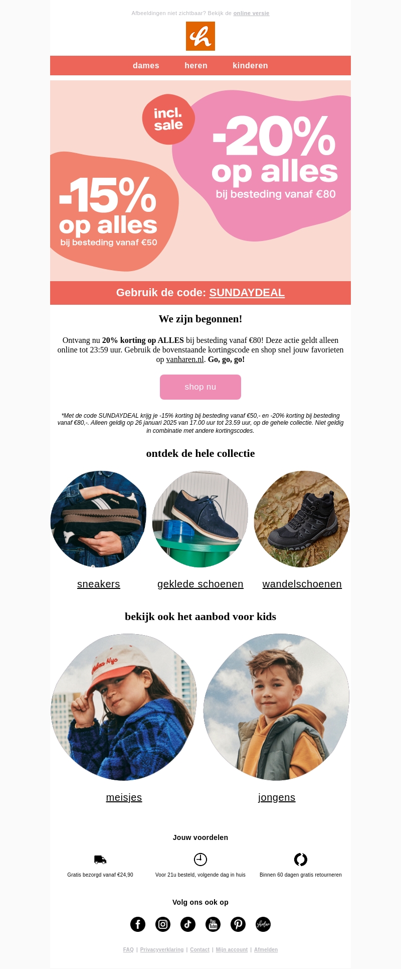 We zijn begonnen! Ontvang nu 20% korting op ALLES bij een besteding vanaf €80. Deze exclusieve aanbieding is alleen vandaag geldig! Gebruik de code SUNDAYDEAL en shop jouw favoriete items in onze uitgebreide collectie voor volwassenen en kinderen.