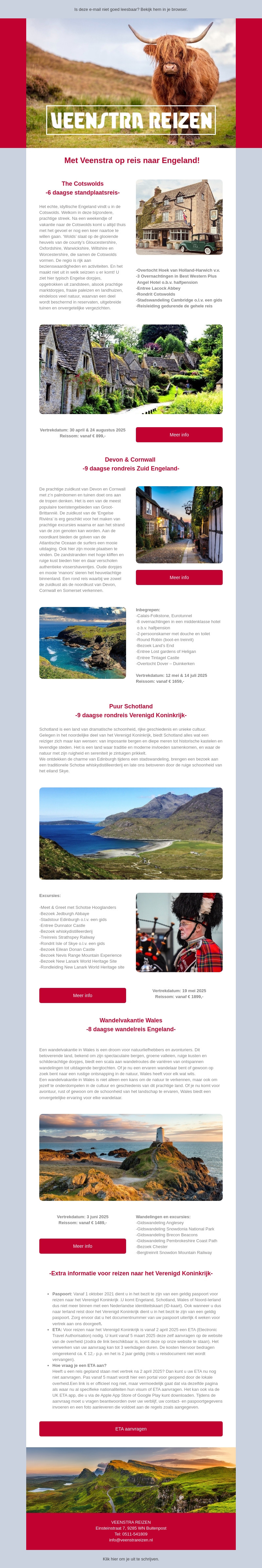 Veenstra Reizen biedt diverse reizen aan naar Engeland, waaronder trips naar de Cotswolds, Devon & Cornwall, en Schotland. Ontdek de prachtige landschappen en charmante dorpjes. Alle reizen zijn zorgvuldig gepland en bieden een unieke ervaring.