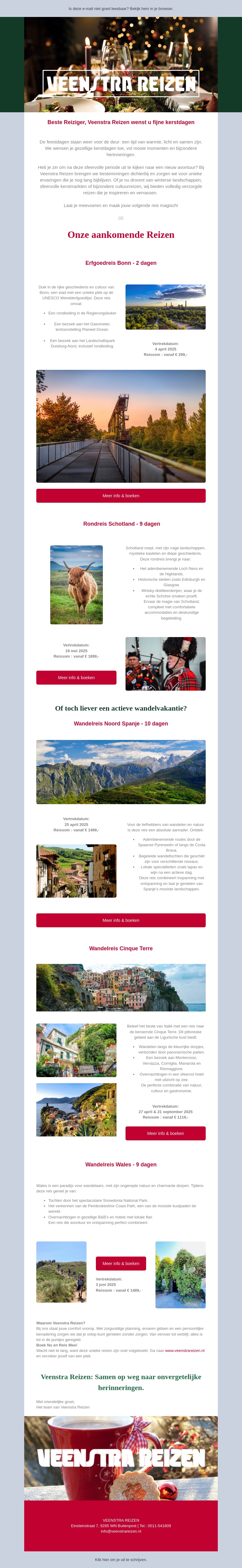 Beleef een inspirerende tijd vol warmte en reisgeluk met Veenstra Reizen. Ontdek onze aankomende reizen en geniet van de schoonheid van nieuwe bestemmingen. Of je nu kiest voor een culturele tour door Bonn of een actieve wandelvakantie in Spanje, er is voor elk wat wils. Plan jouw onvergetelijke uitje en maak herinneringen deze feestdagen. Boek vandaag en geniet van speciale aanbiedingen.