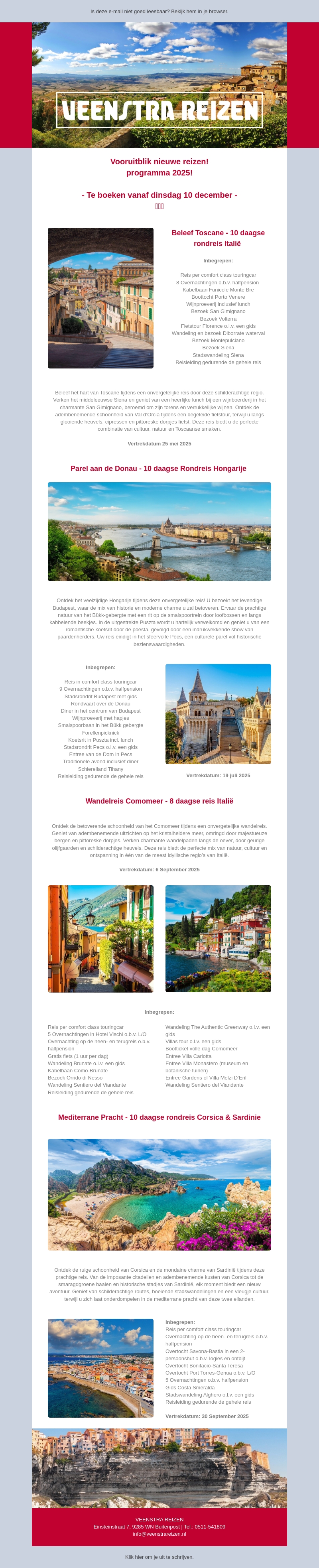 Duik in onze nieuwste reisaanbiedingen voor 2025 met bestemmingen zoals Toscane, de Donau, het Comomeer en Corsica & Sardinië. Boekingen starten op 10 december en elke reis biedt unieke ervaringen en accommodaties.