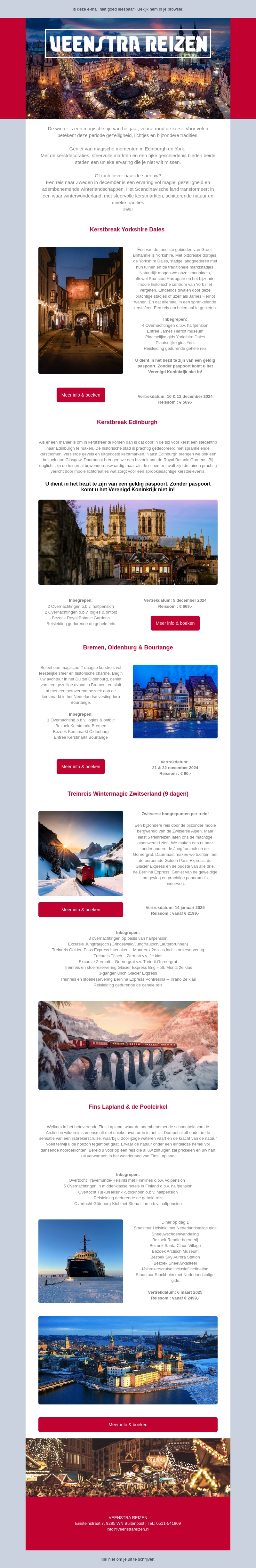 Geniet deze winter van betoverende reisavonturen met Veenstra Reizen. Verken de kerstsfeer in Edinburgh, de prachtige wintersportgebieden in Zwitserland, en het spectaculaire noorderlicht in Lapland. Ontsnap aan de dagelijkse sleur en beleef de magie van de winter op unieke locaties vol charme en geschiedenis. Boek nu en maak je winter onvergetelijk!