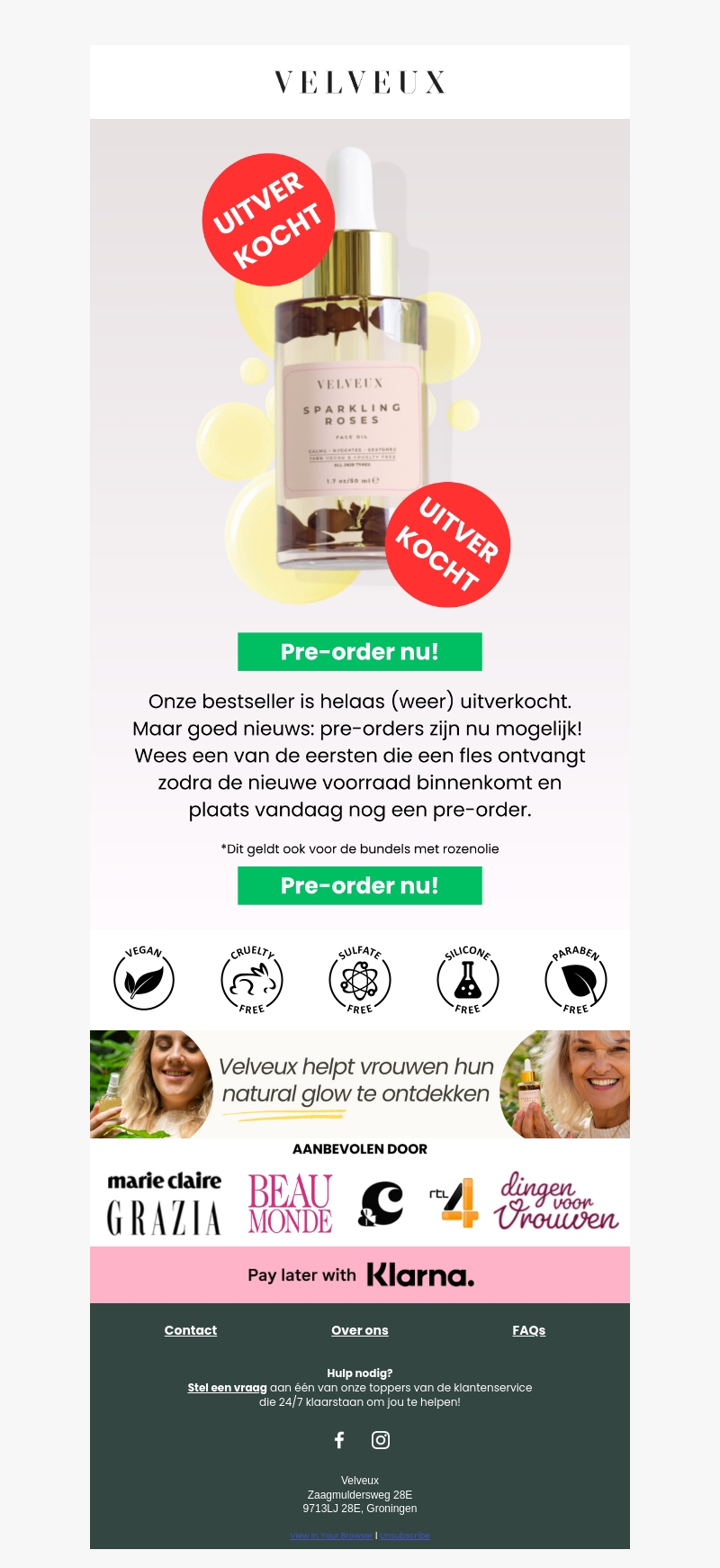 Onze bestseller, de Velveux Sparkling Roses gezichtsolie, is helaas weer uitverkocht. Maar geen zorgen! Je kunt nu een pre-order plaatsen om er zeker van te zijn dat je een fles ontvangt zodra de nieuwe voorraad binnenkomt. Plaats vandaag nog je pre-order en mis het niet!