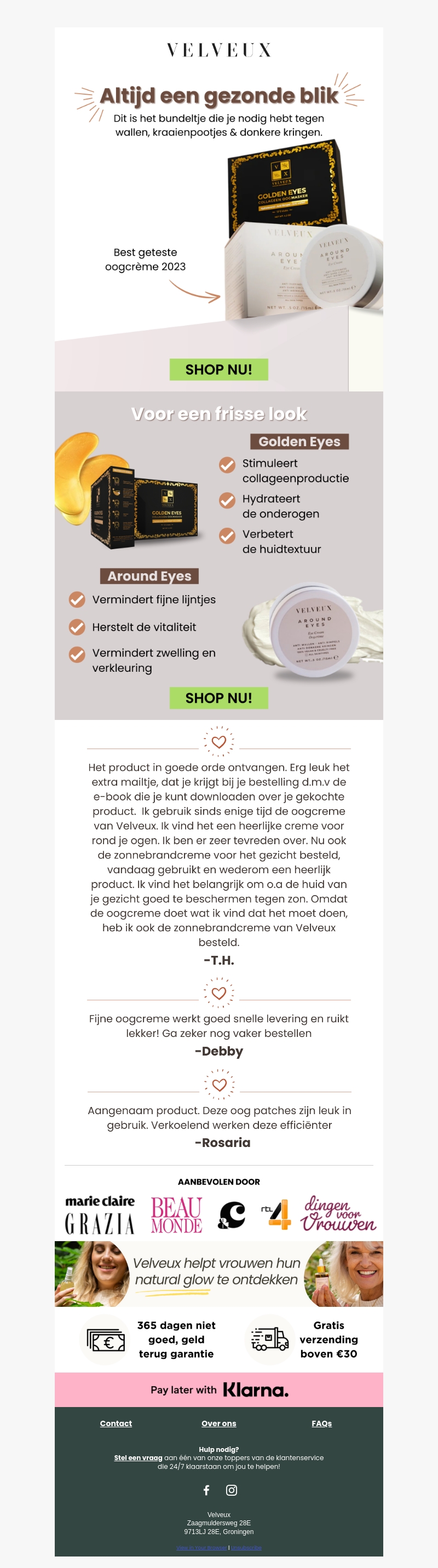 Altijd een gezonde blik met Velveux! Dit bundeltje is perfect om wallen, kraaienpootjes en donkere kringen aan te pakken. De Golden Eyes en Around Eyes producten stimuleren collageenproductie, hydrateren en verbeteren de huidtextuur. Bestel nu en geniet van een frisse look!