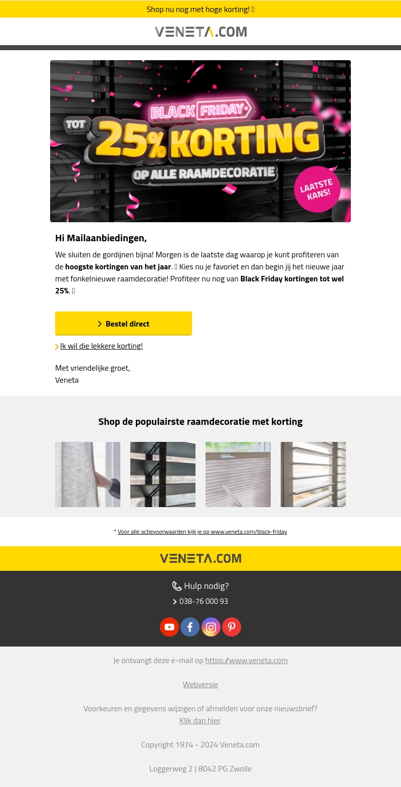 Veneta.com biedt een ultieme Black Friday deal aan. Profiteer van tot wel 25% korting op alle raamdecoratie. Dit is je laatste kans om de grootste kortingen van het jaar mee te pakken. Bestel nu en maak je huis klaar voor het nieuwe jaar met fonkelnieuwe decoratie. Deze aanbieding is alleen geldig tot morgen.
