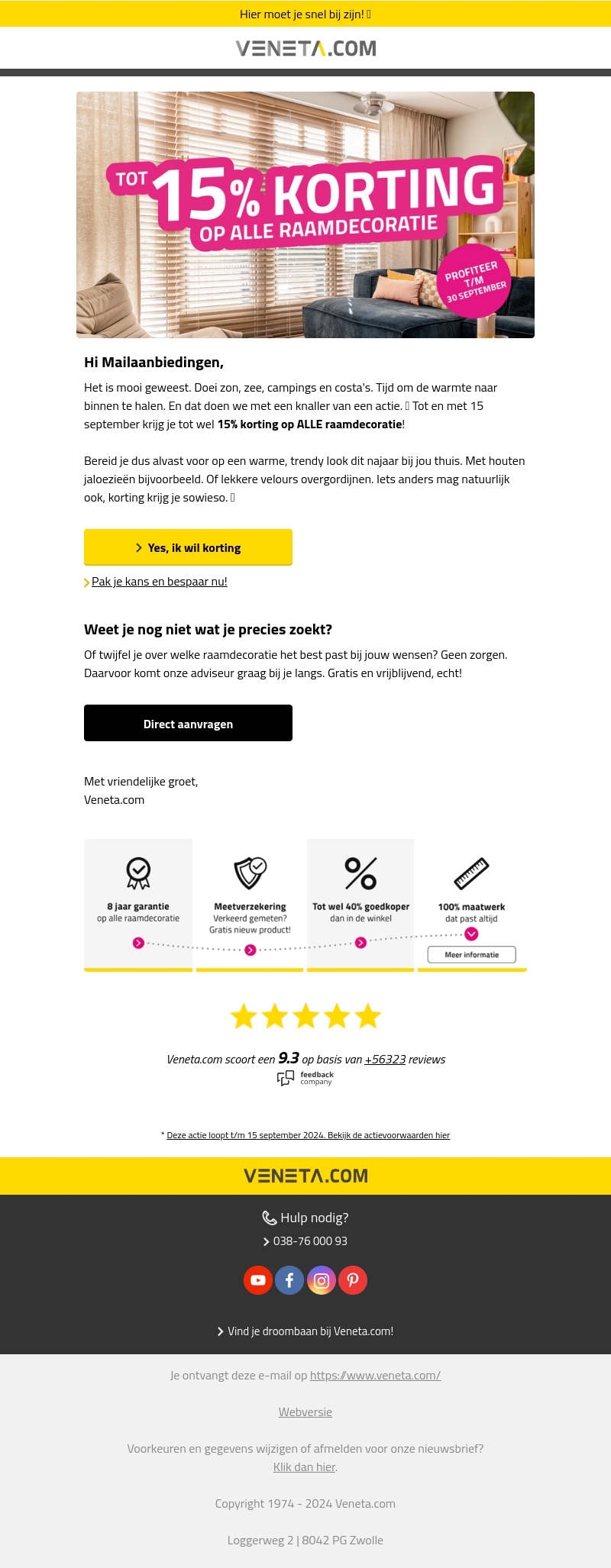 Het is tijd om de warmte naar binnen te halen met de speciale actie van Veneta.com. Ontvang nu tot 15% korting op alle raamdecoratie. Of je nu op zoek bent naar houten jaloezieën of velours gordijnen, je krijgt gegarandeerd korting. Deze actie loopt t/m 15 september. Mis het niet en profiteer nu!