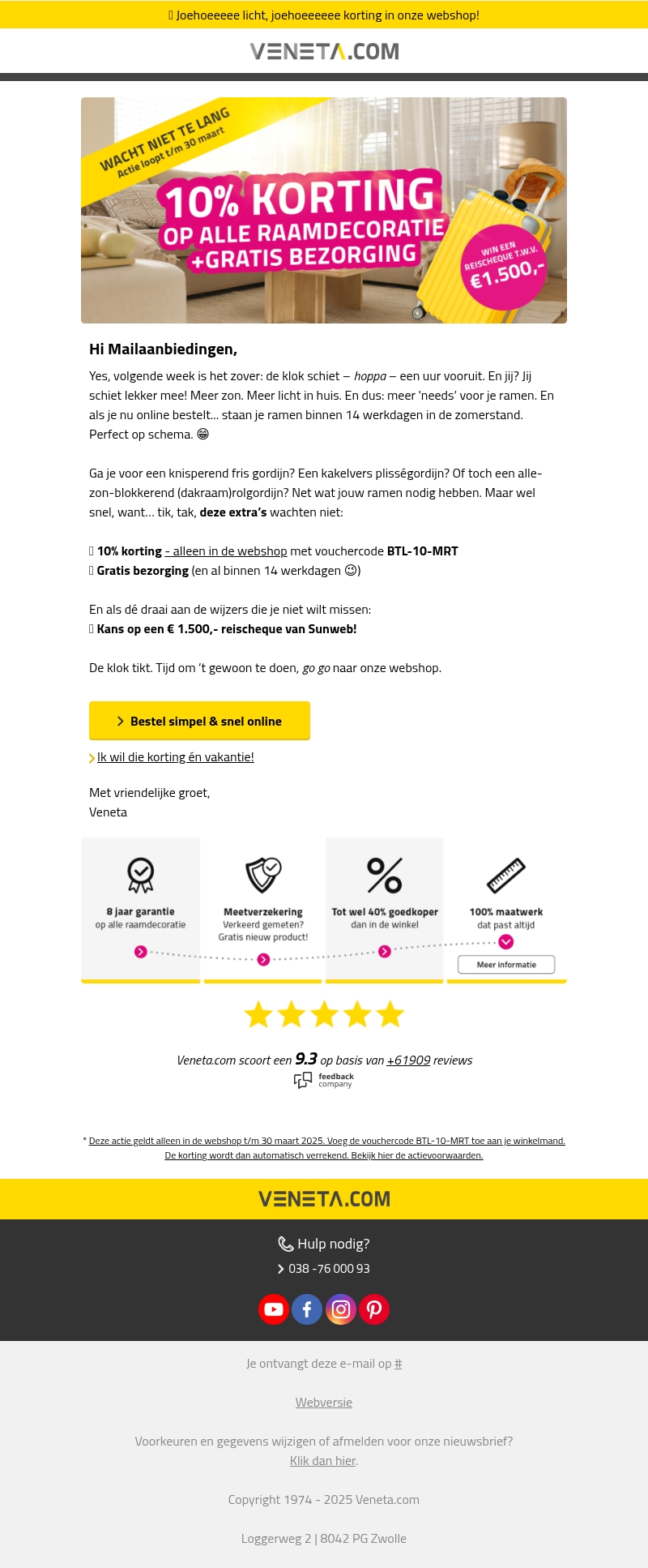 Ontdek de nieuwste raamdecoratie aanbiedingen van Veneta.com met 10% korting en gratis bezorging. Bestel nu online en laat je ramen binnen 14 werkdagen opfrissen. Gebruik de vouchercode BTL-10-MRT en maak kans op een reischeque ter waarde van âŦ1.500. Actie geldig tot 30 maart 2025.