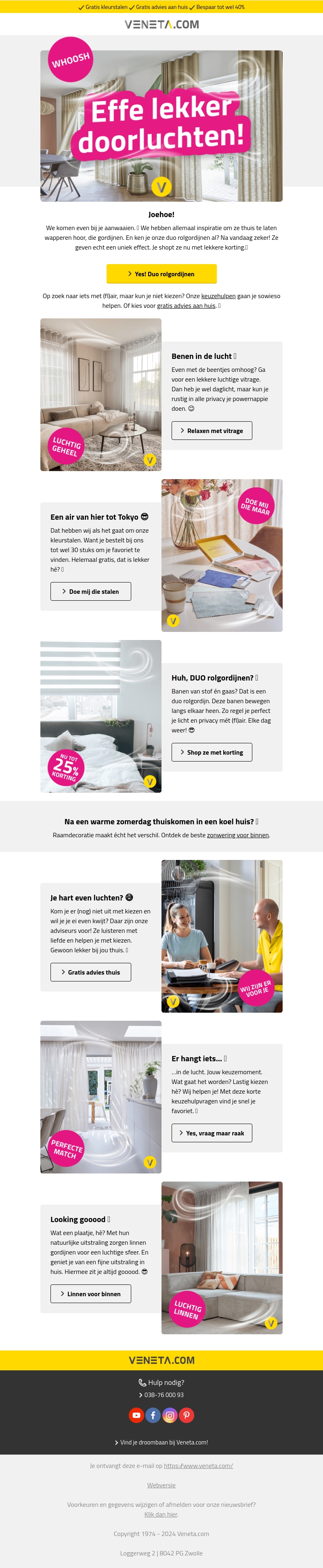 We hebben allemaal inspiratie om de thuis te laten wapperen door rolgordijnen, vitrages en meer. Bekijk onze nieuwe collecties en geniet van het frisse gevoel in huis, nu met speciale kortingen.