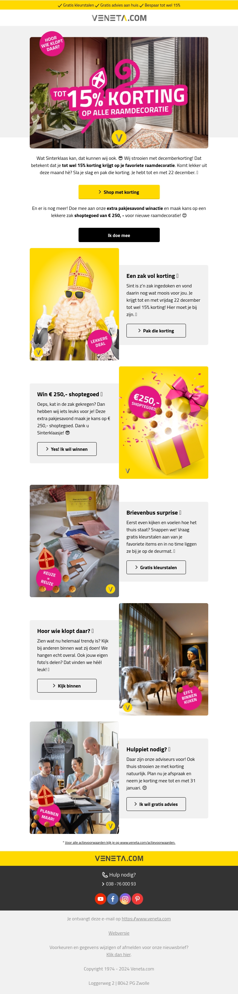 Vier Sinterklaas met een geweldige winactie en geniet van 15% korting op al je favoriete raamdecoratie tot en met 22 december. Kom in de feeststemming en maak kans op een shoptegoed van âŦ250 voor nieuwe raamdecoratie. Vraag gratis kleurstalen aan en ontdek welke stijl het beste bij je past. Sinterklaas maakt december nog feestelijker met deze aanbiedingen!