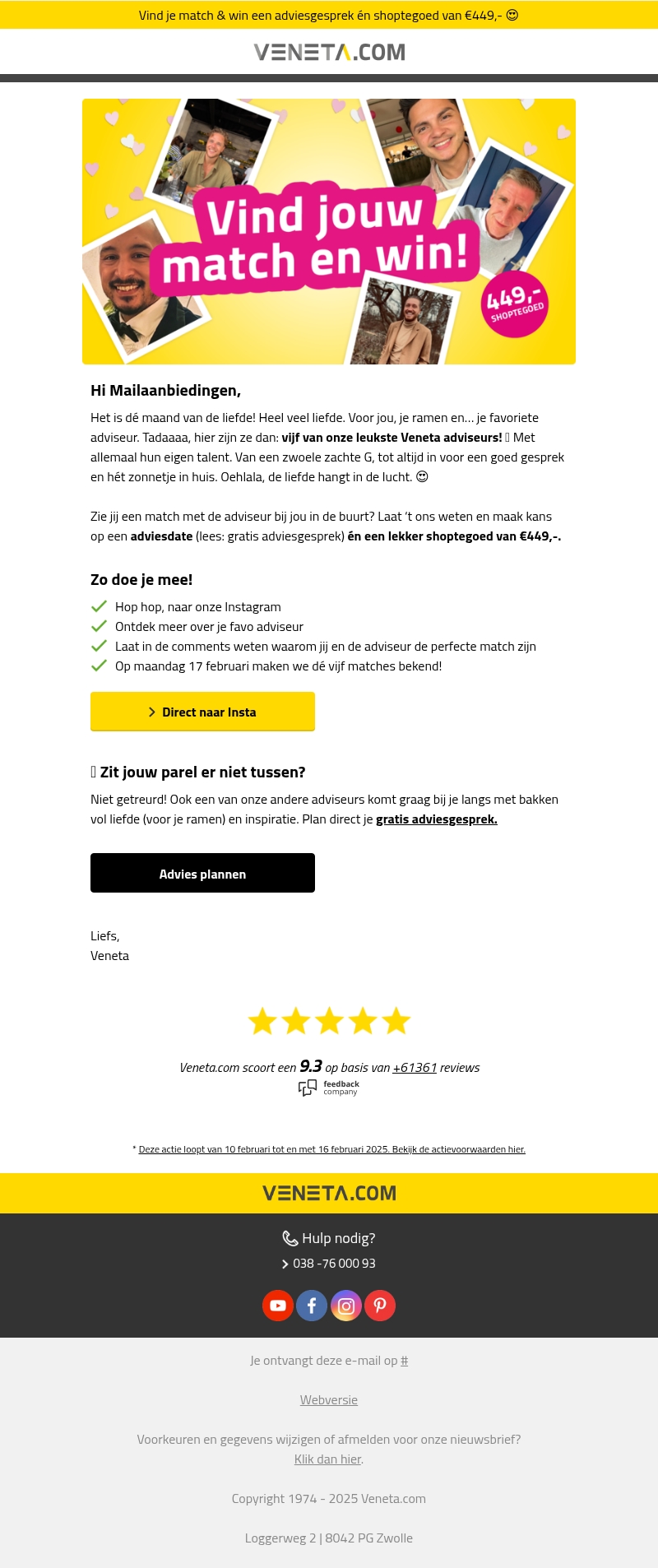 Het is de maand van de liefde, en Veneta.com viert mee! Ontmoet vijf van onze leukste adviseurs die jouw ramen kunnen laten schitteren. Doe mee en maak kans op een gratis adviesgesprek Ên âŦ449,- shoptegoed. Bezoek onze Instagram en vertel waarom jouw match perfect is. Mis deze romantische kans niet en plan direct een afspraak.
