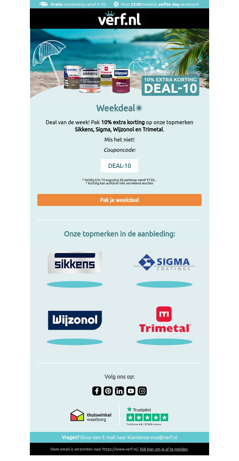 Pak deze week een extra korting van 10% op topmerken verf zoals Sikkens, Sigma, Wijzonol en Trimetal. Gebruik de kortingscode DEAL-10 bij je aankoop. Gratis verzending vanaf €50 en vandaag besteld, morgen in huis.