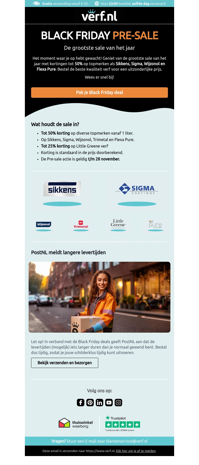 Het is zover! De grootste sale van het jaar begint bij Verf.nl. Geniet van kortingen tot 50% op topmerken zoals Sikkens, Sigma, Wijzonol en Flexa Pure. Deze pre-sale loopt tot en met 28 november. Mis deze kans niet om de beste kwaliteit verf voor een uitzonderlijke prijs te bemachtigen.