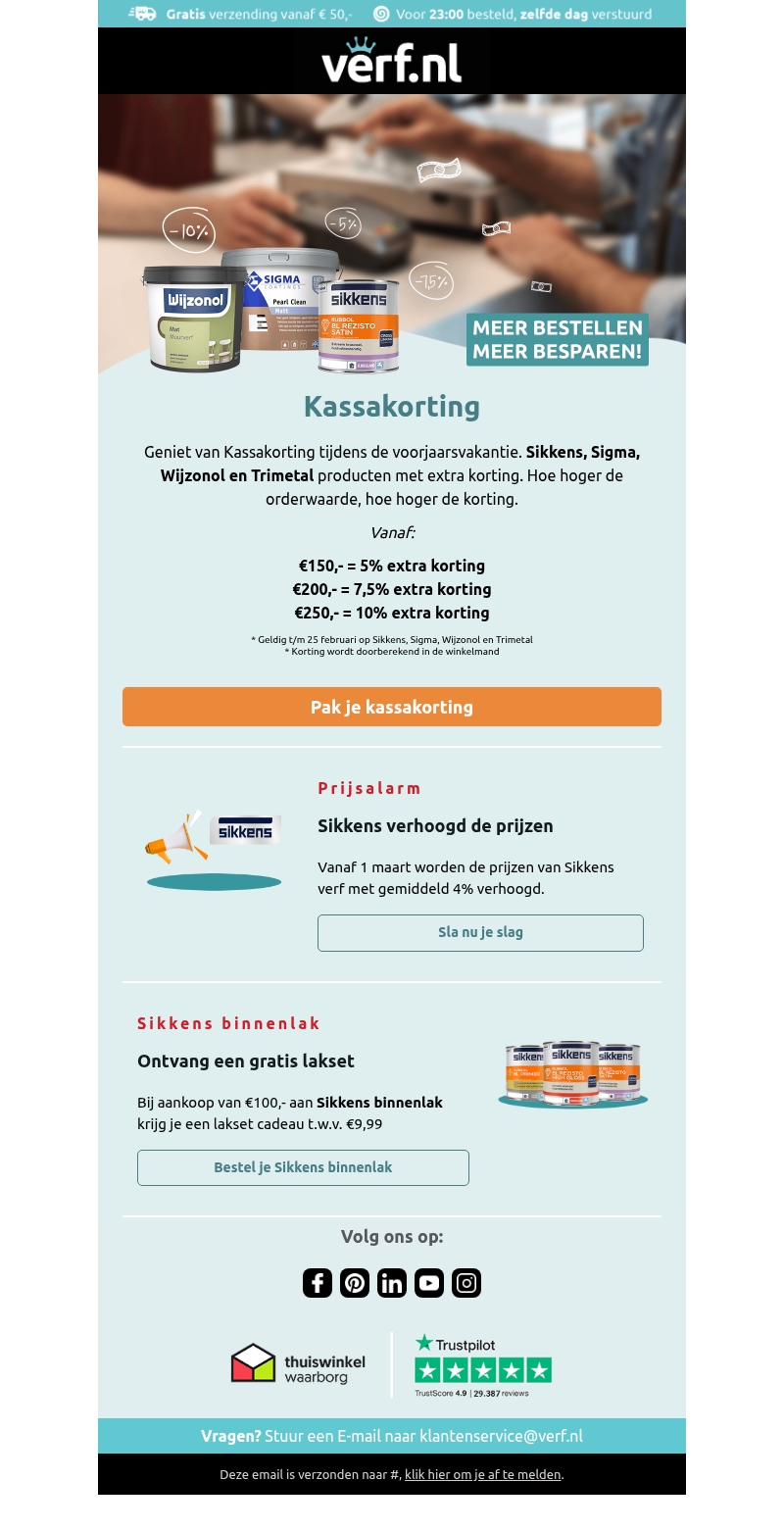 Ontvang nu kassakorting op topmerken zoals Sikkens, Sigma en Wijzonol tijdens de voorjaarsvakantie. Hoe meer je bestelt, hoe hoger de korting: tot wel 10%! Let op: vanaf 1 maart zullen de prijzen van Sikkens-verf stijgen. Profiteer ook van een gratis lakset bij aankoop van Sikkens binnenlak.