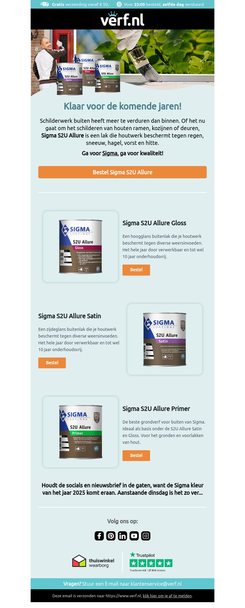 Schilderwerk buiten heeft veel te verduren. Sigma S2U Allure biedt lakken die houtwerk beschermen tegen diverse weersinvloeden zoals regen, sneeuw, en hitte. Kies voor de hoogglans, zijdeglans of primer varianten en geniet van jarenlang onderhoudsvrij houtwerk. Bestel vandaag nog bij verf.nl!