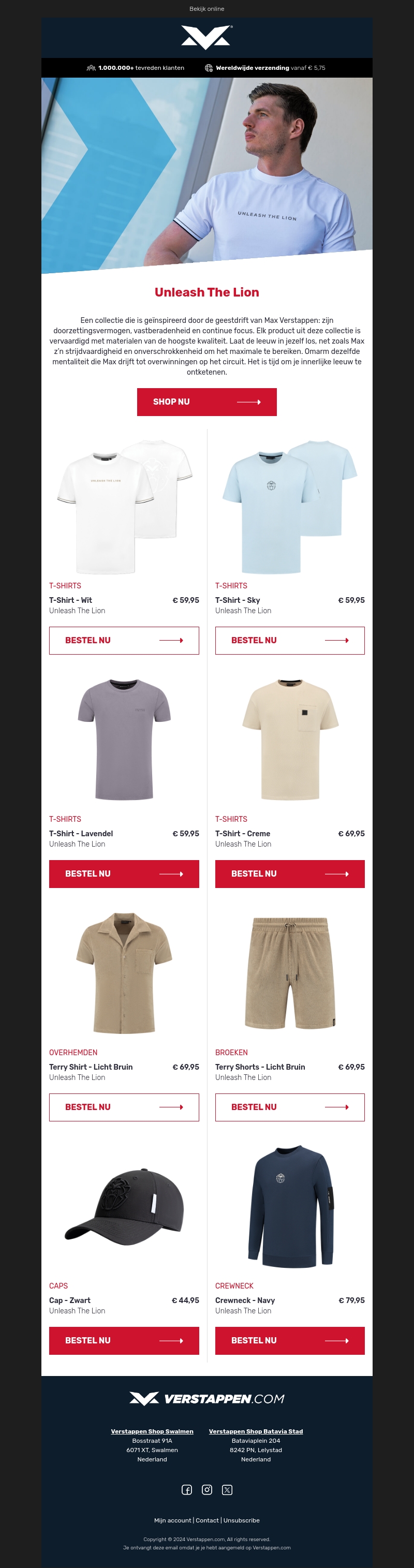 Een nieuwe collectie geïnspireerd door Max Verstappen's strijdlust en vastberadenheid. Hoogwaardige materialen en stijlvolle ontwerpen voor iedereen die zijn innerlijke leeuw wil ontketenen. Verkrijgbaar in een breed scala aan kleuren en stijlen. Mis het niet en bestel nu!