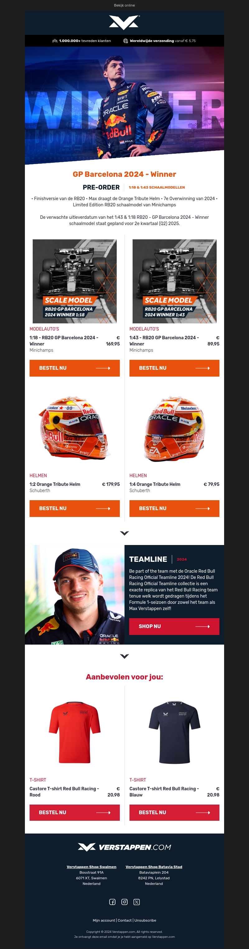 Pre-order nu de Limited Edition RB20 schaalmodellen (1:18 en 1:43) van de GP Barcelona 2024 Winner! Deze miniaturen zijn verkrijgbaar vanaf het tweede kwartaal van 2025. Ontdek ook de nieuwste merchandise, zoals de Red Bull Racing hallen en officiΓ«le teamkleding van 2024.