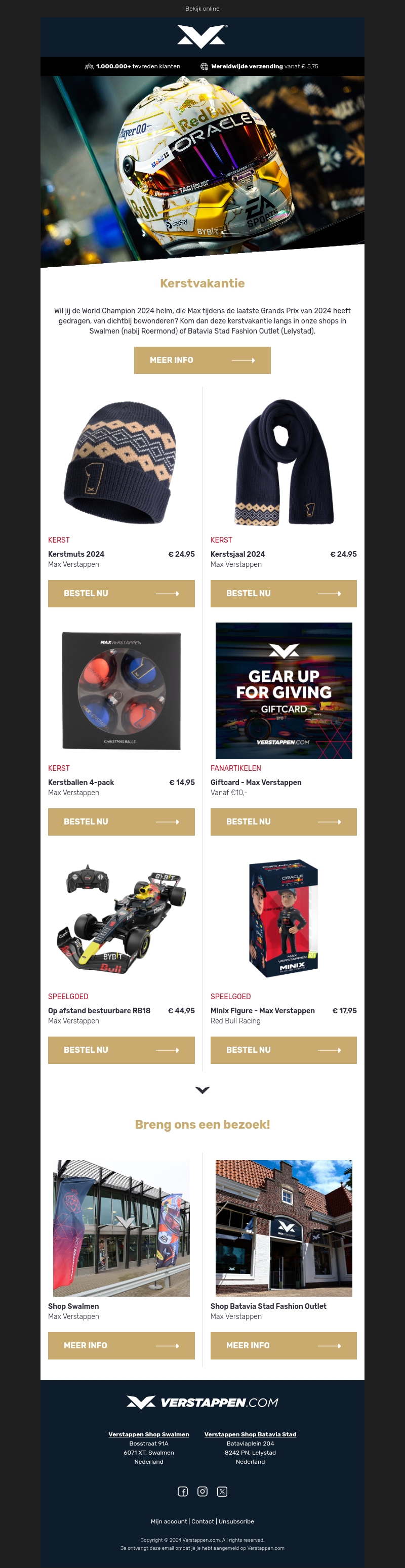 Bezoek onze winkels tijdens de kerstvakantie om de exclusieve Max Verstappen 2024 helm van dichtbij te bewonderen. Ontdek onze kerstcollectie, waaronder mutsen, sjaals en speciale kerstballen. Vind geweldige cadeaus voor fans zoals afstand bestuurbare auto's en meer. Bereid je voor op een sportieve kerst met onze unieke fanartikelen. Kom langs in Swalmen en Batavia Stad Fashion Outlet. Ontdek magische momenten met ons kerstaanbod.