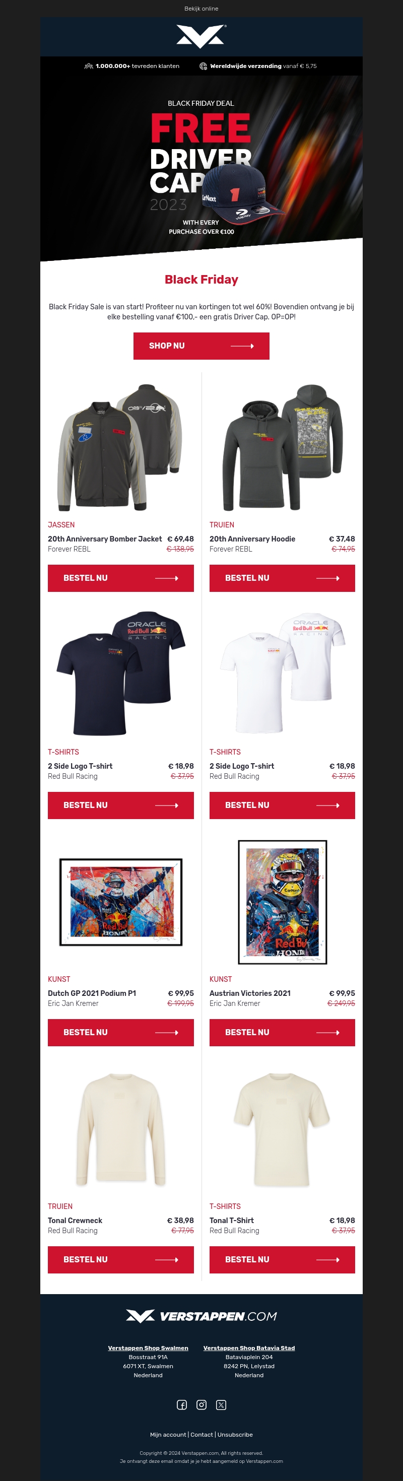 Bereid je voor op de ultieme Black Friday Sale! Ontvang kortingen tot wel 60% op geselecteerde producten. Bij elke bestelling vanaf €100 krijg je bovendien een gratis Driver Cap. Geniet van aanbiedingen op jassen, truien, T-shirts en kunst. Wees snel, want op=op!