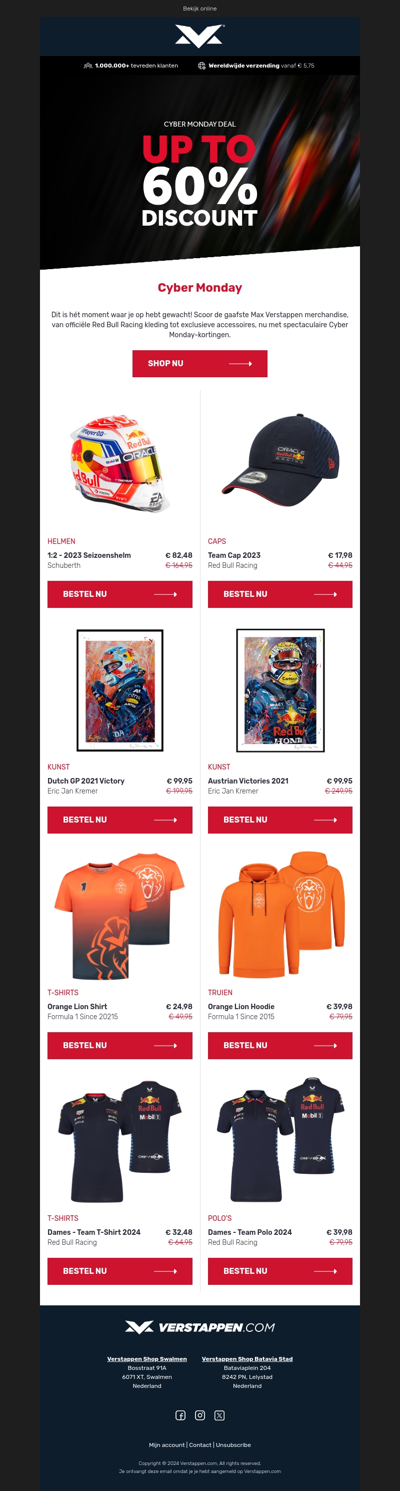 Ontdek nu de spectaculaire Cyber Monday-kortingen op Max Verstappen merchandise. Van officiële Red Bull Racing kleding tot exclusieve accessoires, alles met kortingen tot wel 60%. Zorg dat je jouw favoriete items niet mist en bestel vandaag nog.