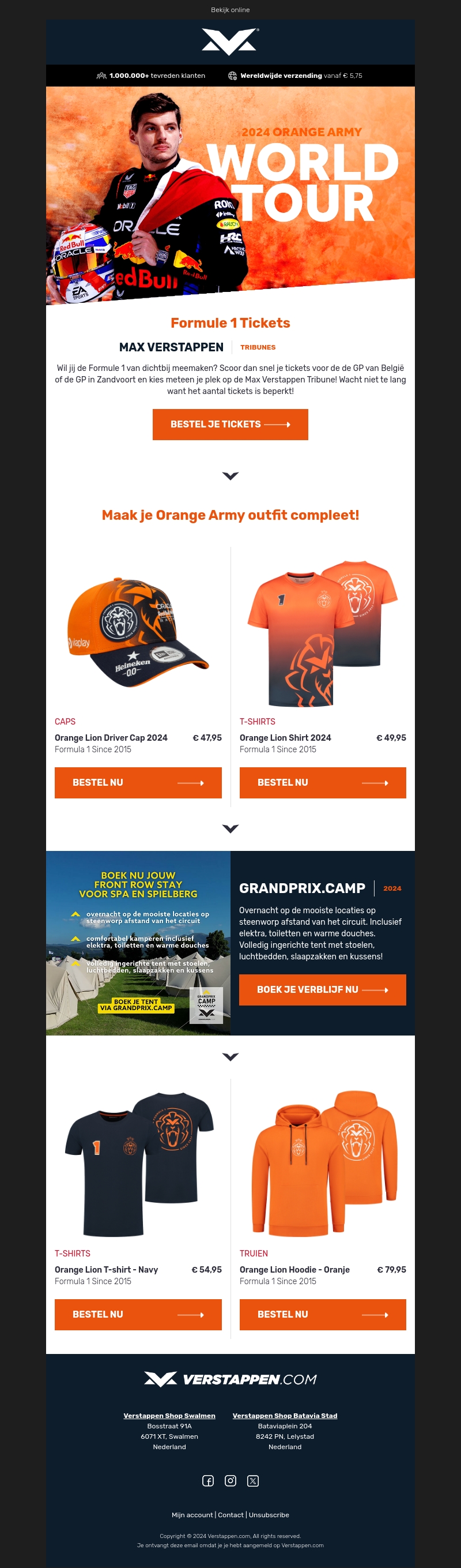 Wil jij de Formule 1 van dichtbij meemaken? Scoor dan snel je tickets voor de GP van België of de GP in Zandvoort en kies meteen je plek op de Max Verstappen Tribune! Wacht niet te lang, want het aantal tickets is beperkt. Vergeet niet je Orange Army outfit compleet te maken met exclusieve merchandise, zoals de Orange Lion Driver Cap en het Orange Lion Shirt. Boek ook je verblijf via Grandprix.camp voor een onvergetelijke race-ervaring!