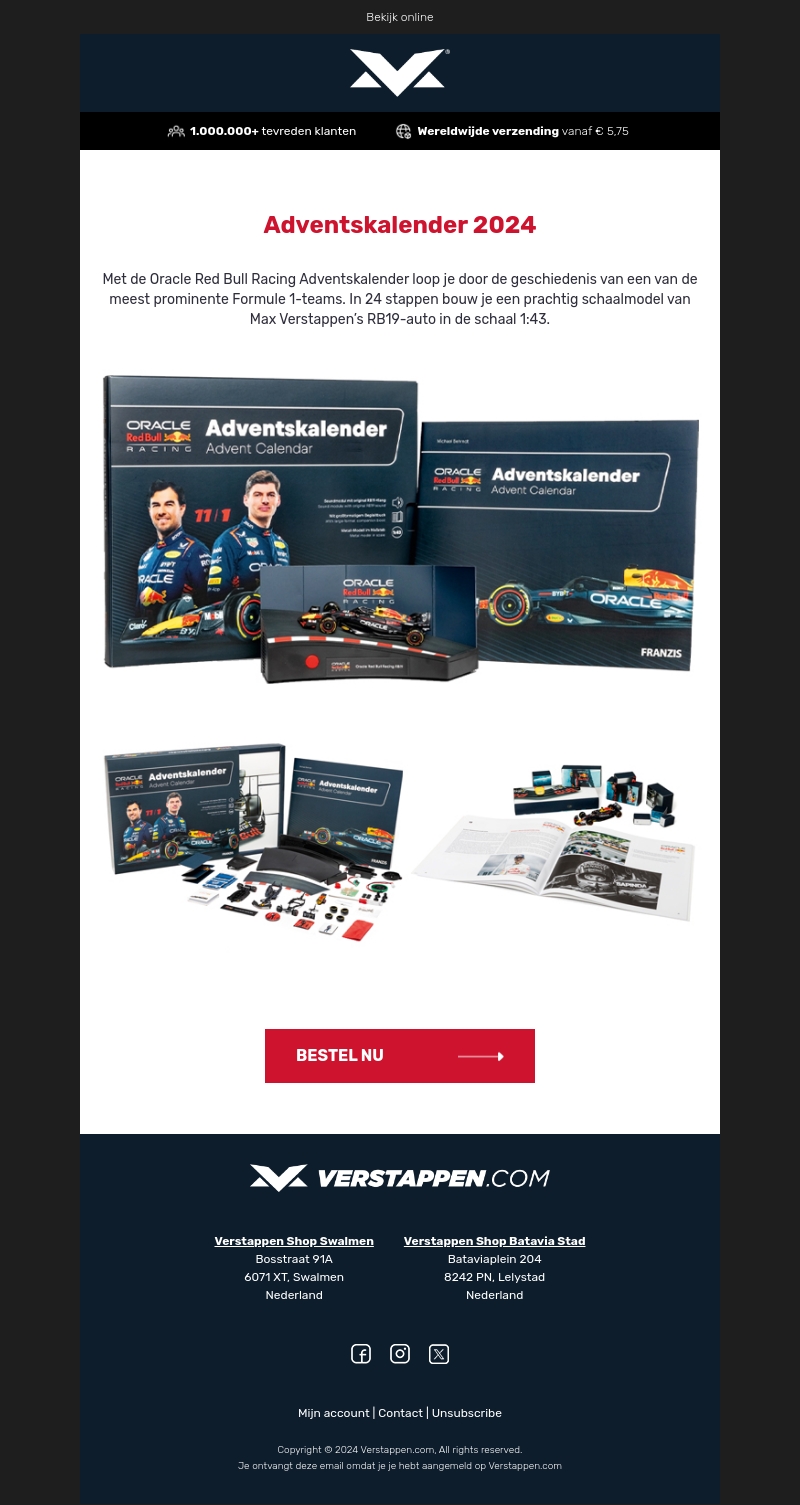 Beleef de spanning van Formule 1 dagelijks met de Red Bull Racing Adventskalender 2024. Elke dag brengt je dichter bij het compleet maken van Max Verstappen's RB19 schaalmodel. Perfect voor fans die willen aftellen naar de feestdagen met een Formule 1-tintje.