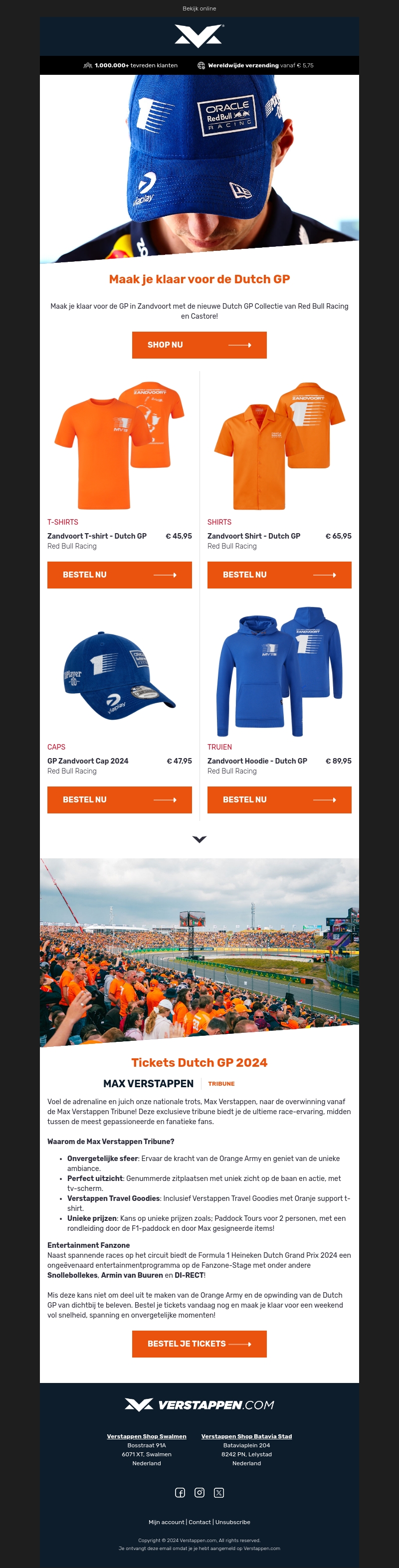 Bereid je voor op de Dutch Grand Prix met de nieuwste collectie van Red Bull Racing, inclusief shirts, petten en truien. Reserveer ook je plaats in de Max Verstappen Tribune voor een unieke race-ervaring. Geniet van exclusieve prijzen, goodies en entertainment op de Fanzone-Stage.