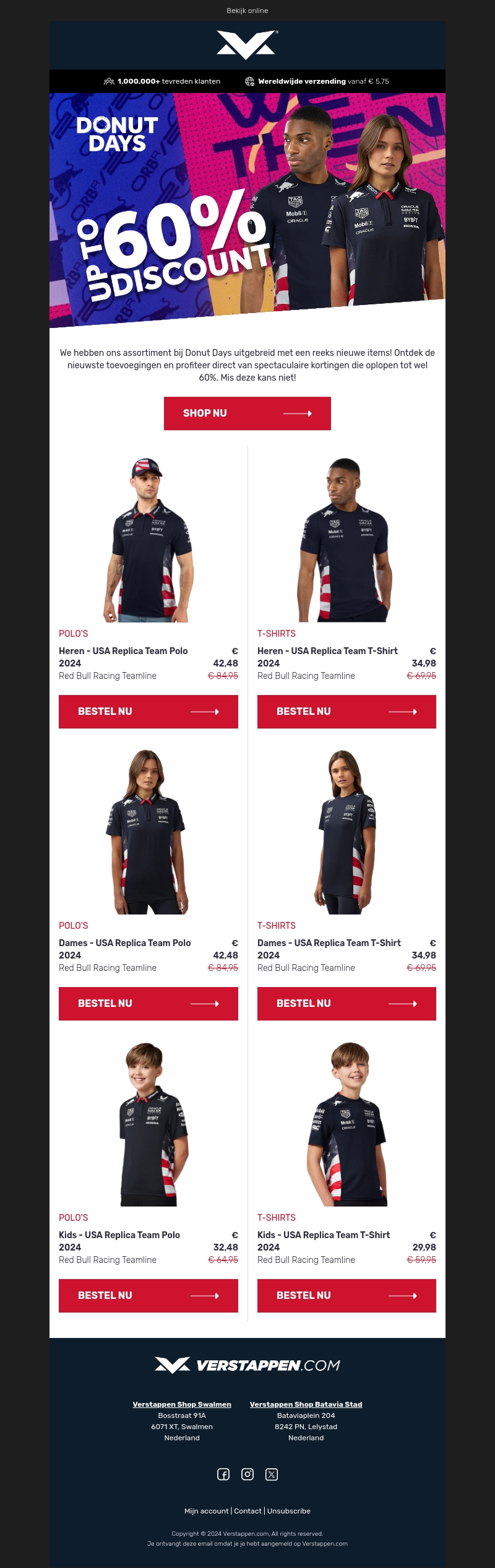 Tijdens Donut Days zijn er spectaculaire kortingen op een groot assortiment artikelen. Met kortingen die oplopen tot 60% kun je jouw favoriete items tegen scherpe prijzen in huis halen. Wacht niet langer, want deze beperkte aanbiedingen zijn snel uitverkocht. Verken de nieuwste collectie van USA Replica Team kleding en accessoire items. Shop vandaag nog en mis deze ongelooflijke deals niet.