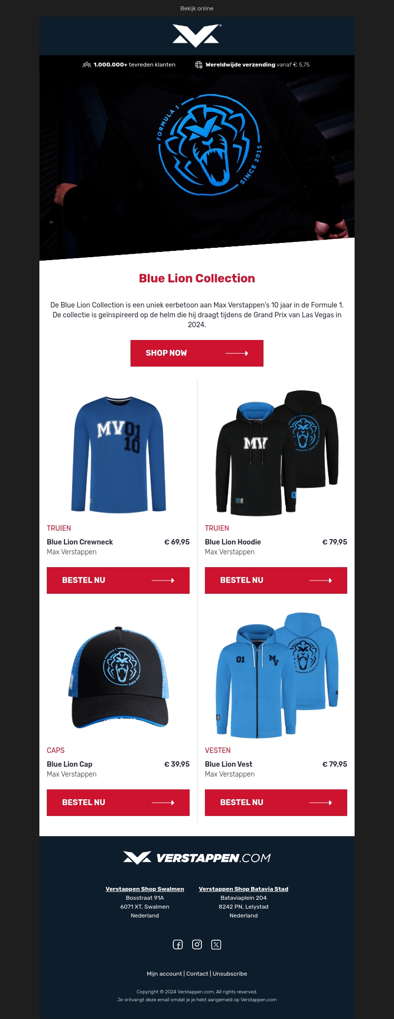 De Blue Lion Collectie is een eerbetoon aan Max Verstappens 10 jaar in de Formule 1. Deze collectie is geïnspireerd op de helm die hij draagt tijdens de Grand Prix van Las Vegas in 2024. Ontdek truien, caps en vesten in de iconische stijl van Verstappen. Shop nu en toon je support met deze exclusieve merchandise.