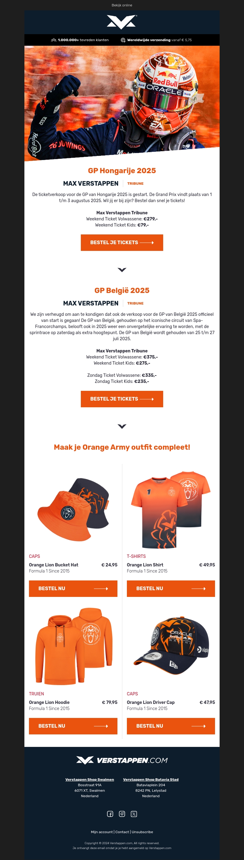 De ticketverkoop voor de GP van Hongarije en de GP van België 2025 is gestart! Ben je een fan van Max Verstappen? Zorg dan dat je erbij bent en geniet van deze onvergetelijke races. Bekijk ook onze exclusieve Orange Army merchandise!