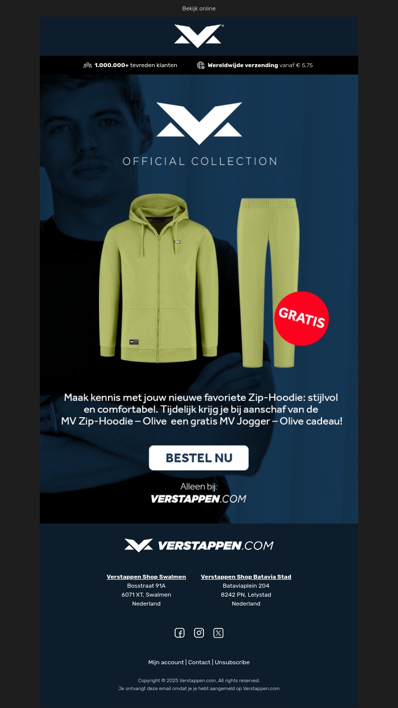 Maak kennis met jouw nieuwe favoriete Zip-Hoodie: stijlvol en comfortabel. Bij aanschaf van de MV Zip-Hoodie – Olive krijg je tijdelijk een gratis MV Jogger – Olive cadeau. Met meer dan 1.000.000 tevreden klanten wereldwijd en verzending vanaf €5,75, ben je verzekerd van kwaliteit en stijl. Mis deze exclusieve aanbieding niet en bestel nu bij Verstappen.com. Kom langs bij onze winkels in Swalmen of Batavia Stad.