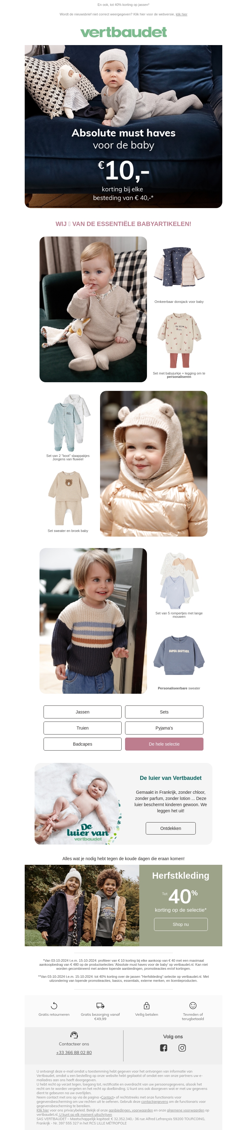 Verwen je baby met de essentiële must-haves van Vertbaudet. Ontvang nu €10 korting bij elke besteding van €40 aan geselecteerde producten. Van schattige truien tot warme jassen, ontdek de perfecte outfit voor elke gelegenheid. Mis deze unieke kans niet om te besparen op hoogwaardige babykleding en accessoires.
