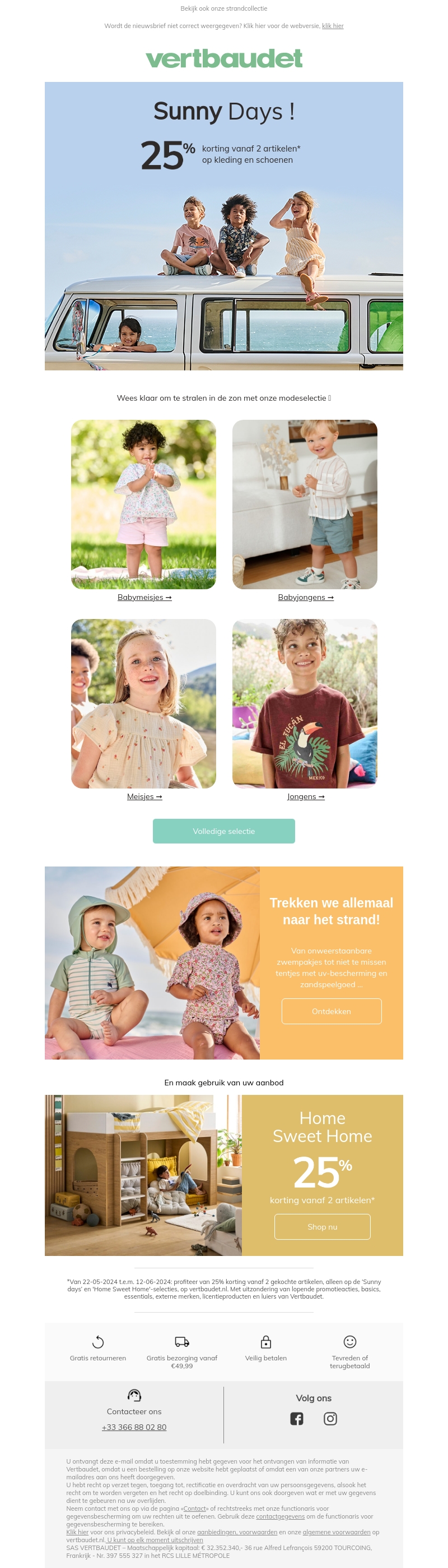 Bereid je voor op zonnige dagen met een geweldige aanbieding van Vertbaudet. Profiteer van 25% korting op kleding en schoenen voor baby's en kinderen bij aankoop van 2 artikelen. Bekijk onze strandcollectie en thuismodeselectie voor de beste outfits voor elke gelegenheid.