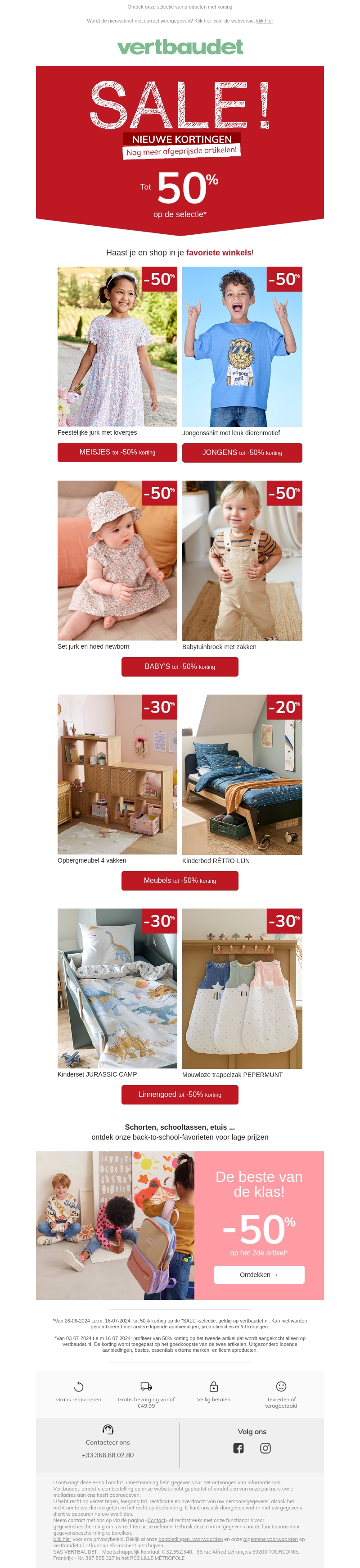 Geniet van enorme kortingen tot 50% op een grote selectie artikelen bij Vertbaudet. Van meisjes- en jongensmode tot babykleding, meubels en linnengoed, er is voor iedereen wel wat te vinden. Mis de kans niet om geweldige deals te scoren. Bezoek onze winkels of shop online voor de beste aanbiedingen.