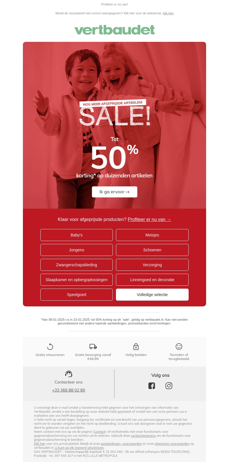 Mis de kans niet om te profiteren van kortingen tot 50% op duizenden artikelen bij Vertbaudet. Van babykleding tot decoratie, er is voor ieder wat wils. Schrijf je nu in en bespaar op je favoriete producten!