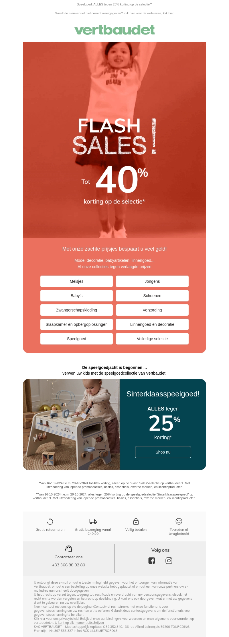 Vertbaudet lanceert spectaculaire Flash Sales met kortingen tot 40%! Ontdek mode, decoratie, babyartikelen en meer tegen verlaagde prijzen. Verwen uw kinderen met de speelgoedcollectie inclusief Sinterklaasspeelgoed met 25% korting. Shop nu en bespaar op uw favoriete items!