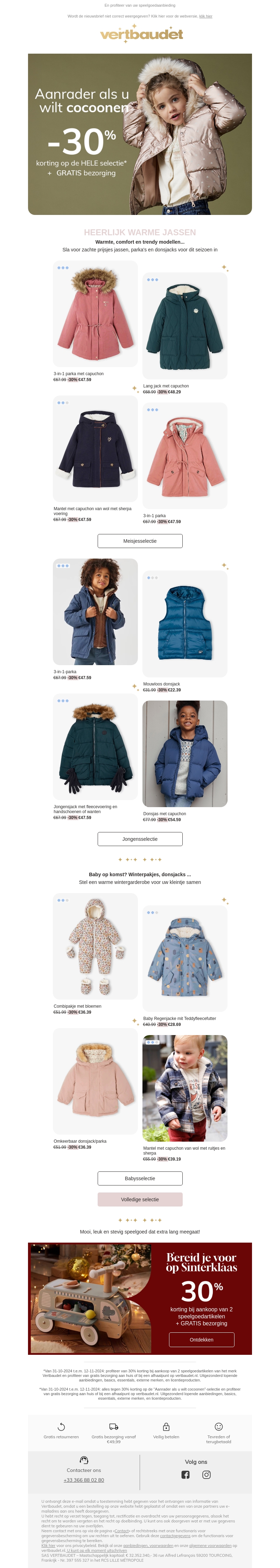 De winter is hier! Geniet van 30% korting op een selectie jassen, truien en pyjama's bij Vertbaudet. Bereid je voor op koud weer met onze modieuze, warme kleding. Sinterklaas staat voor de deur, maak gebruik van onze speciale aanbiedingen. Bestel nu en geniet van gratis bezorging. Mis deze kans niet om te besparen!