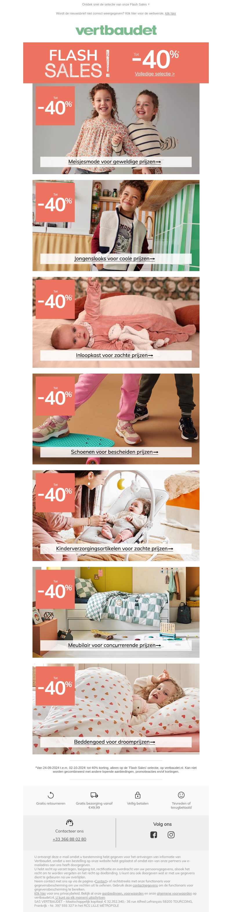 Profiteer van de Flash Sales bij Vertbaudet! Bespaar tot 40% op een groot assortiment aan artikelen inclusief meisjesmode, jongenslooks, babykleding, kinderverzorgingsartikelen, meubilair en beddengoed. Bekijk de volledige collectie en shop jouw favorieten.