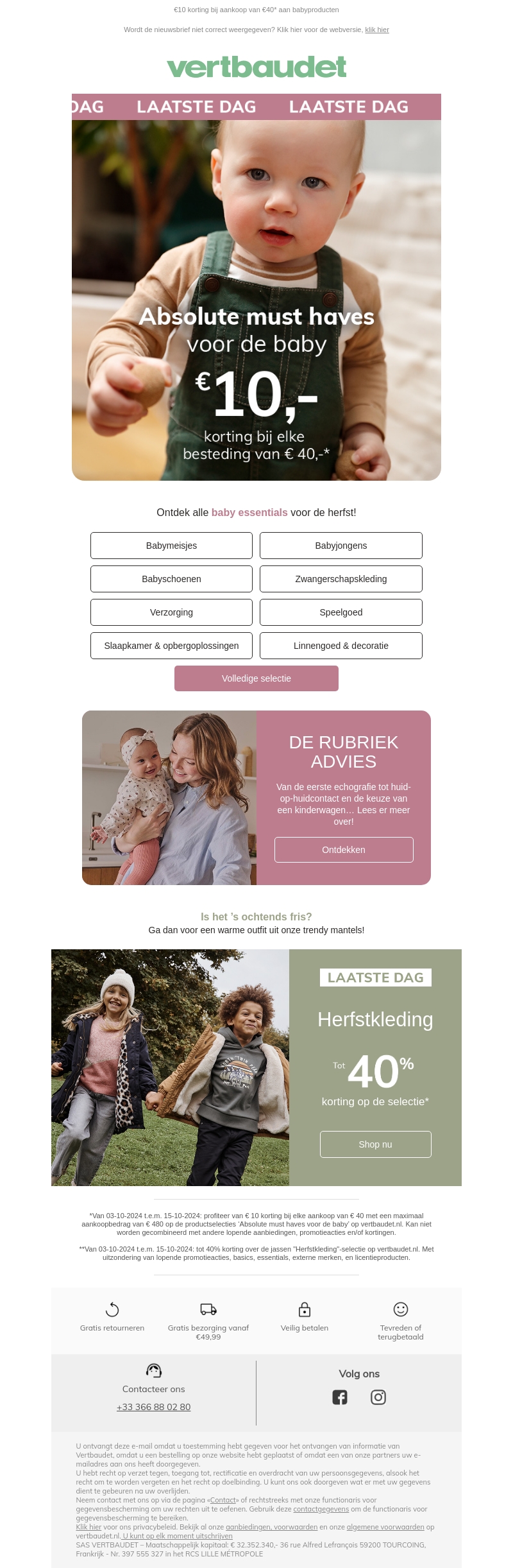 Mis niet de laatste dag van geweldige kortingen op onmisbare babyartikelen bij Vertbaudet. Geniet van €10 korting bij elke besteding van €40 op babyproducten. Ontdek ook de herfstkleding voor kinderen met tot wel 40% korting. Alle baby essentials voor de herfst zijn nu beschikbaar.